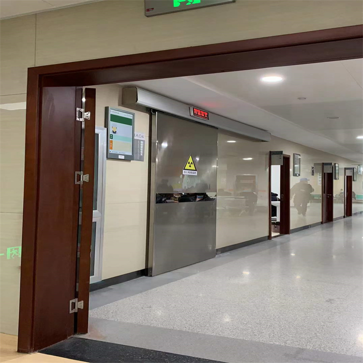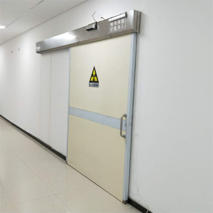 X射线铅门的结构包括门体、门板、合页和密封条等部件。其中,门体采用矩形钢管焊接而成,门板采用镀锌板或不锈钢板制作,内衬有厚度为3mm~5mm的密封材料,外衬装有吸声棉。合页为两片平行相连的金属片,中部装有合页螺栓。密封条采用橡胶、塑料或者其他耐辐射材料制成,外衬为不锈钢或者镀锌板。